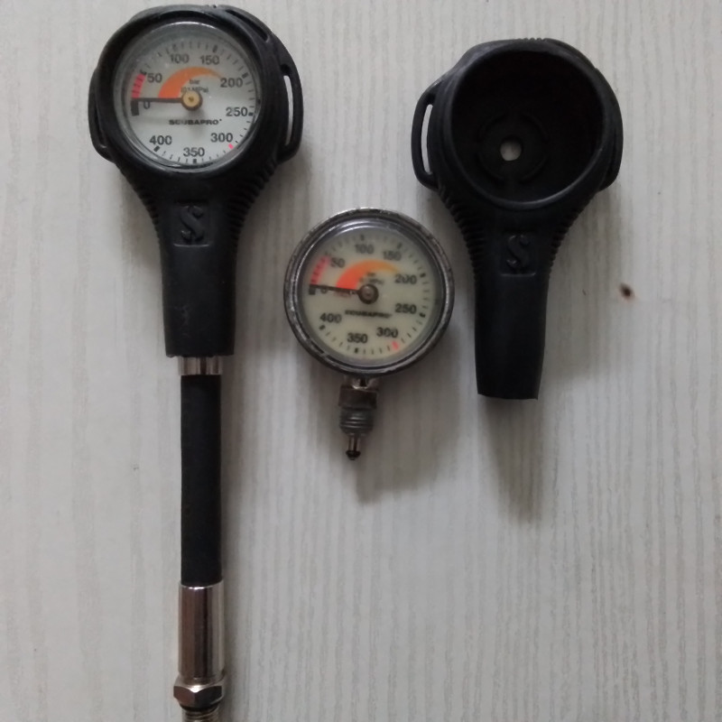 I offer two pressure meters of Scubapro . 1x with short hose in good condition for 25 EUR and 1x with stronger signs of use and swivel for 15 EUR. Shipping and Wero possible.