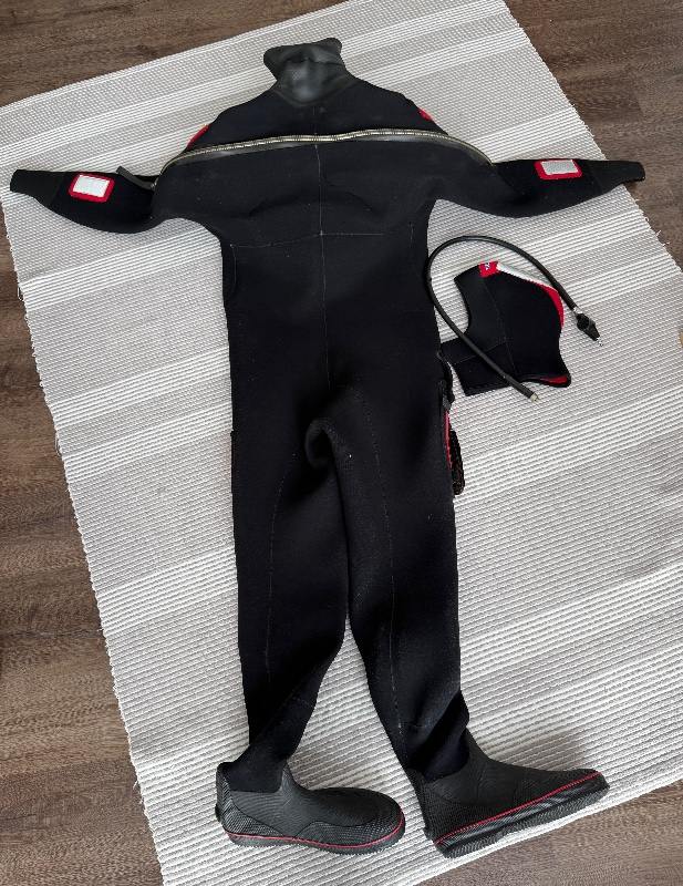 I offer an N-Diver drysuit with back entry. Size XL/ 54-56 Shoe size 46. And the matching undersuit, see photo.