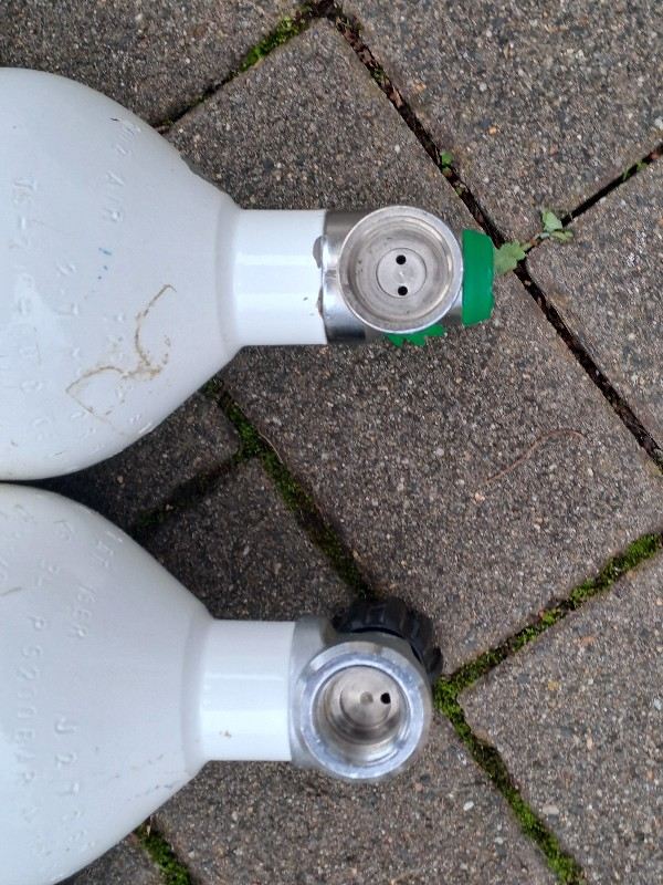Double 10 liter diving tanks with current TÜV. Plus argon bottle (without TÜV). The argon bottle is equipped with 1st stage + pressure gauge and hose. The whole thing is fastened with suspenders from Dir Zone. I've done many, many dives with this configuration. The double 10s are filled with compressed air. 200 Bar