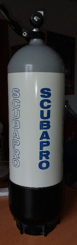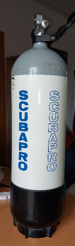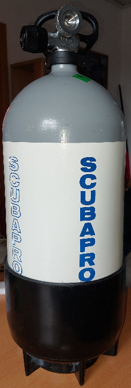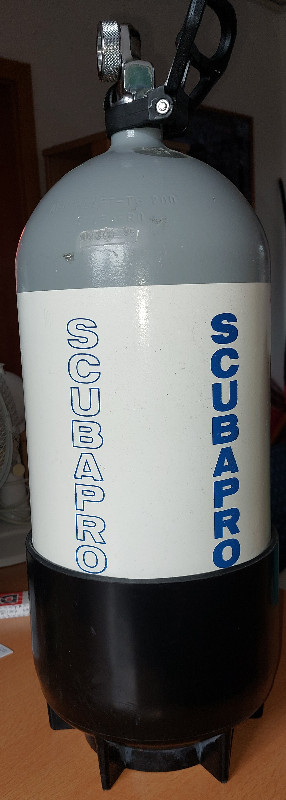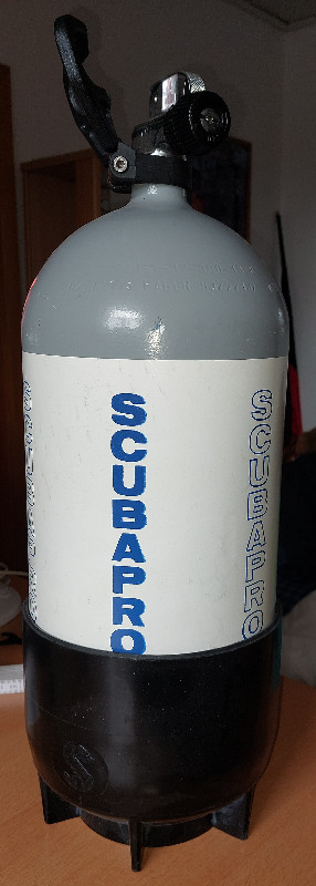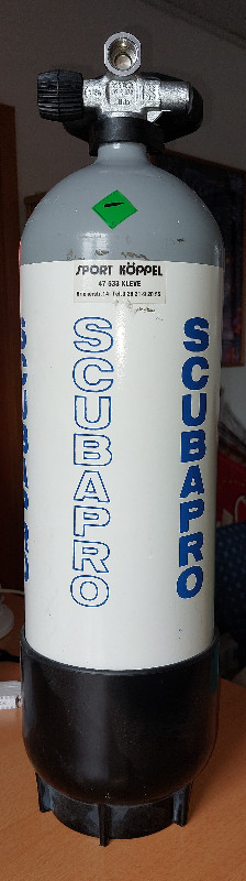 This sale is about a compressed air device original diving tank from Scubapro. The capacity of the bottle is 10 liters. Height of the bottle approx. 55 cm, diameter approx. 16 cm.