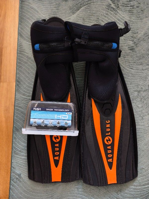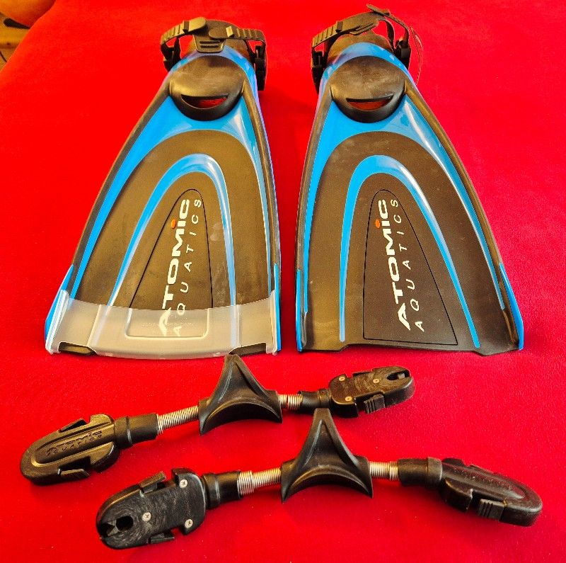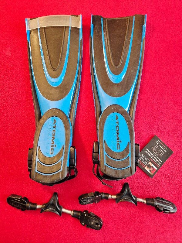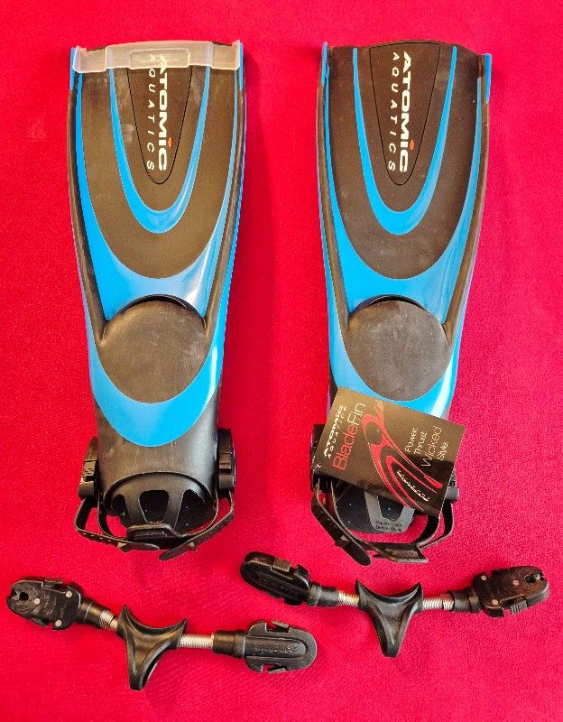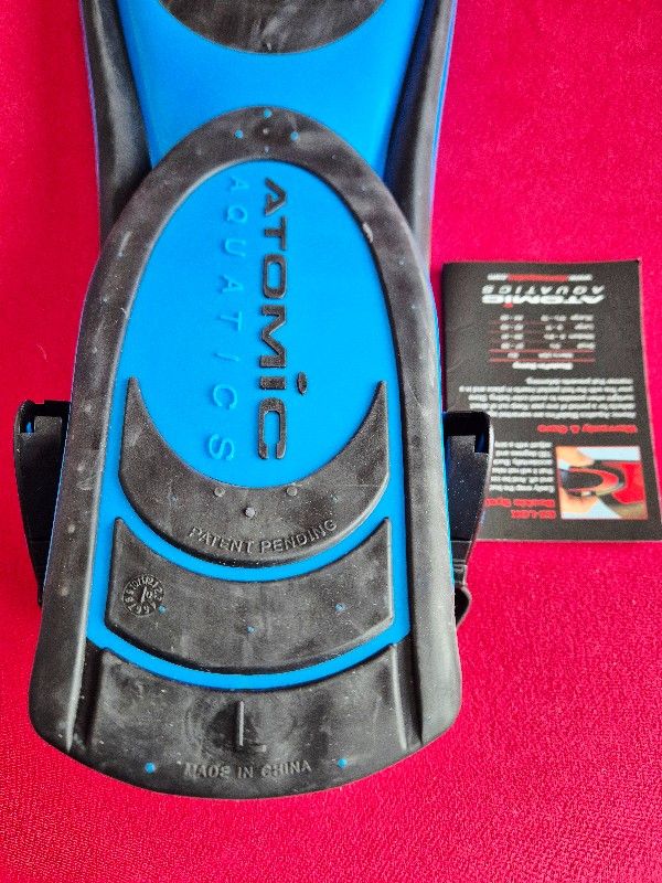 Ein Paar neue, unbenutzte, original verpackte blaue Atomic Aquatics Blade Flossen, Größe L, mit original Flossenbänder für NUR 119 € und zusätzlich mit Atomic Aquatics Spring Straps (gebraucht) möchte ich für NUR 159 € plus 11 € (Flossenlänge) versicherten Versand verkaufen :-)