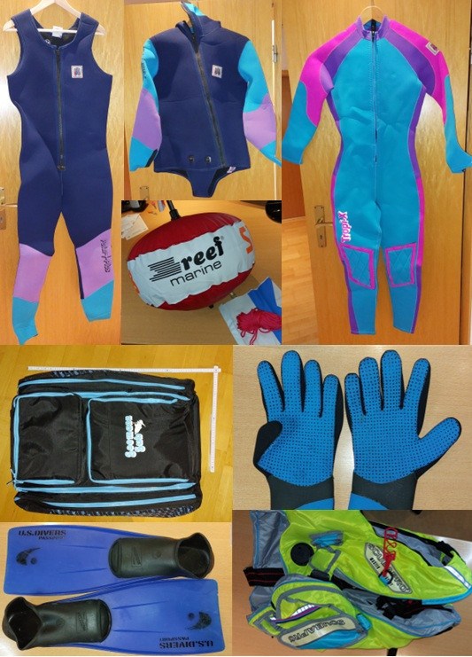 Zum Verkauf stehen zwei vollständige Tauchausrüstungen (ohne Masken), eine für Damen (Größe S) und eine für Herren (Größe M/94).