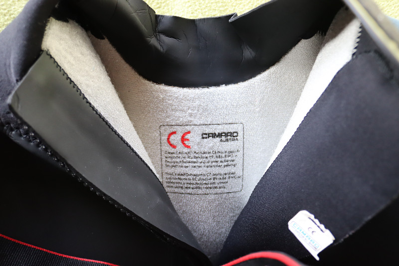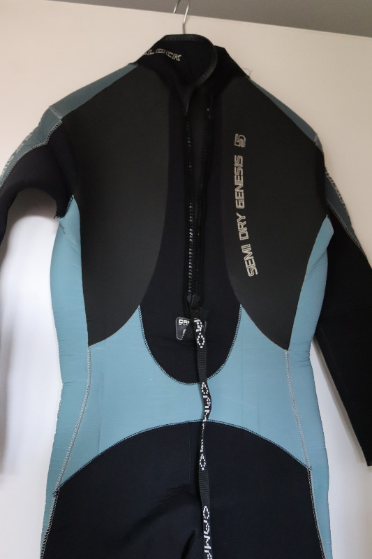 Neopren, Größe L-42, Farbe schwarz-blau, 5 mm, Rückenreißverschluss, Dichtungsmanschetten und Zipps an Armen und Beinen, G-Flex Strech Zone, Innenbeschichtung.