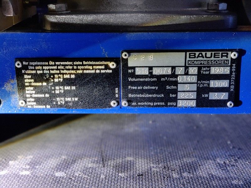 Der Bauer K 14 Kompressor ist Bj.1980, Luftliefermenge 210 Liter/min, 3060 Betriebsstunden. Der Kompressor läuft tadellos, ist 2020 mit einer neuen Filterüberwachung ausgestattet worden. Es ist eine komplette Dokumentation vorhanden, einen Liter Öl gibt es dazu. Weiteres entnehmen Sie bitte Fotos. Der Kompressor lief nur im Vereinsbetrieb.